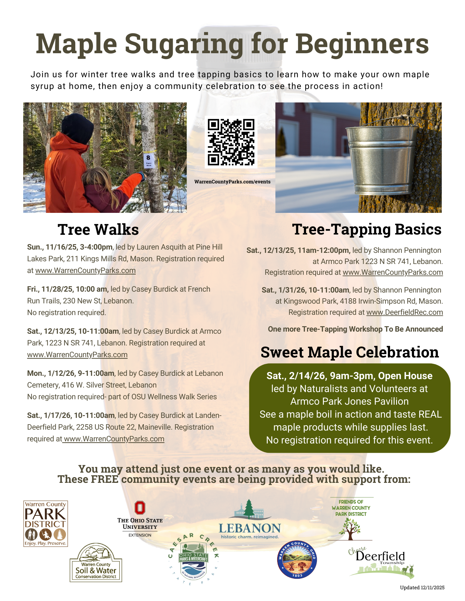 Join us inside the heated Kingswood Park Activity Center to learn all about maple sugaring! We will go over the basic supplies you would need to tap your own trees (hint: it's not a lot!) and the simple process of how to turn maple sap into REAL maple syrup! ODNR tree identification guides will be provided for registered participants to take home.